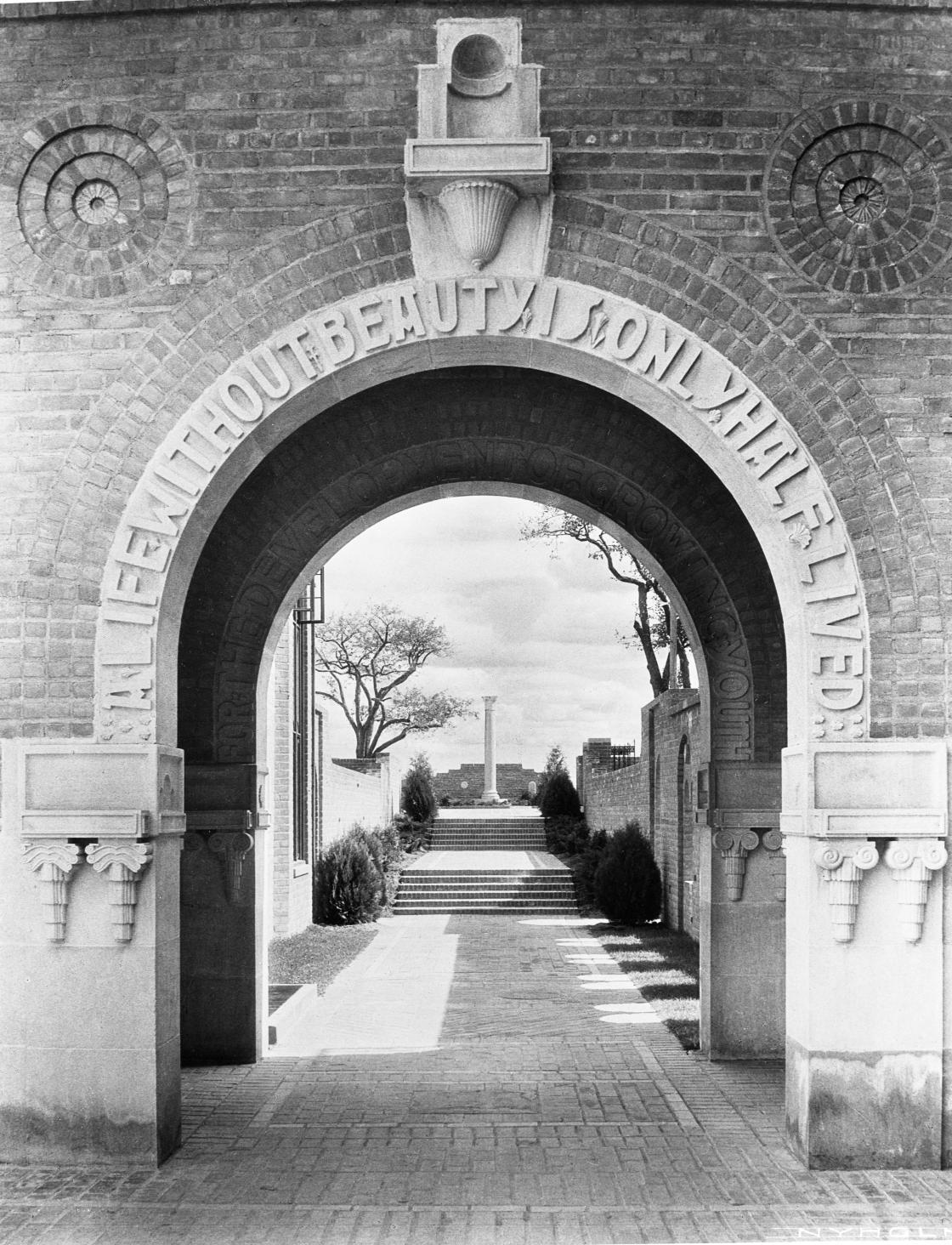 Beauty Arch at Cranbrook School, “A Life Without Beauty is Only Half Lived” attributed to George Gough Booth. Cranbrook School for Boys, Eliel Saarinen, Bloomfield Hills, Michigan, 1926-1928. Cranbrook Archives, Cranbrook Center for Collections and Research.